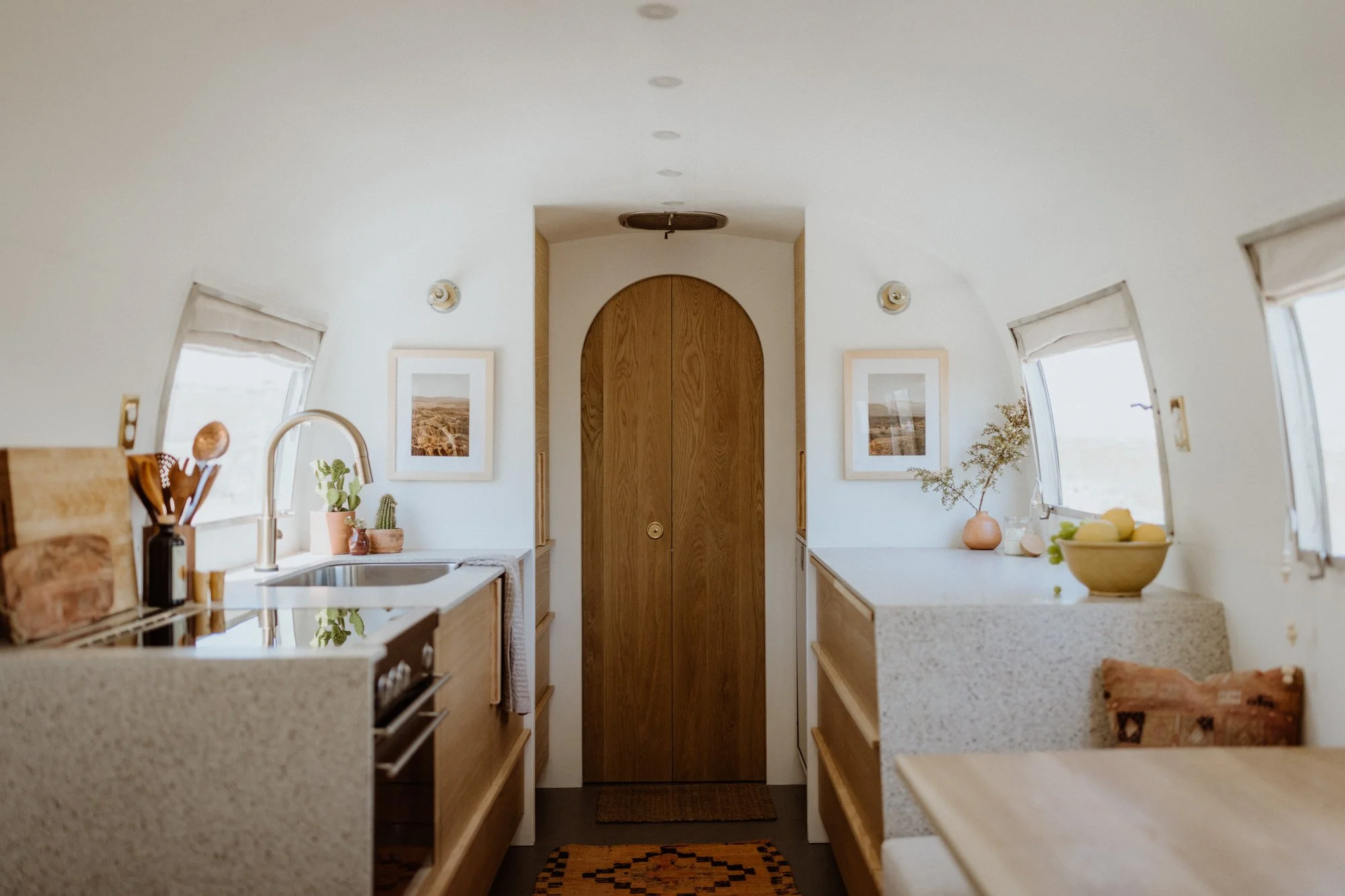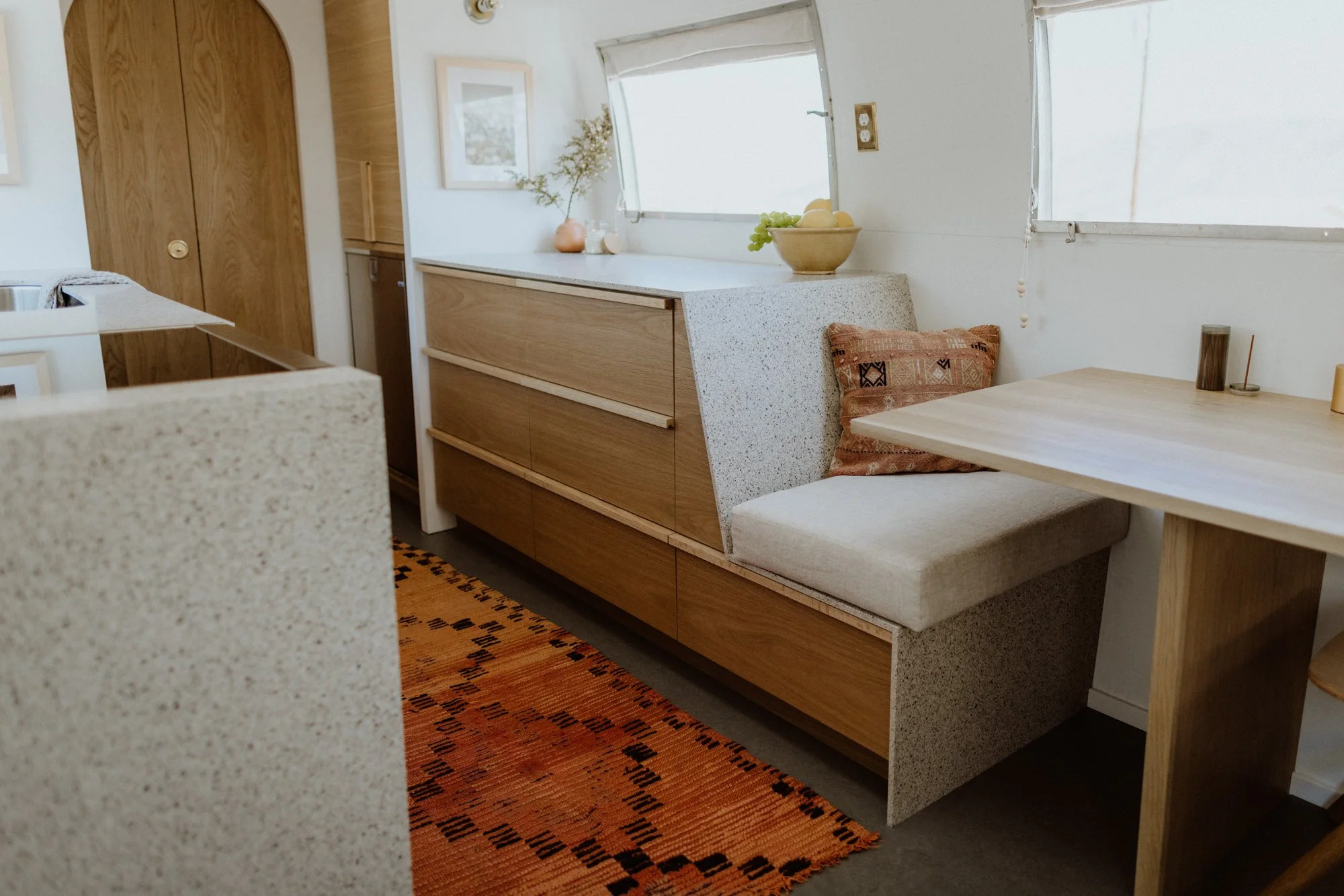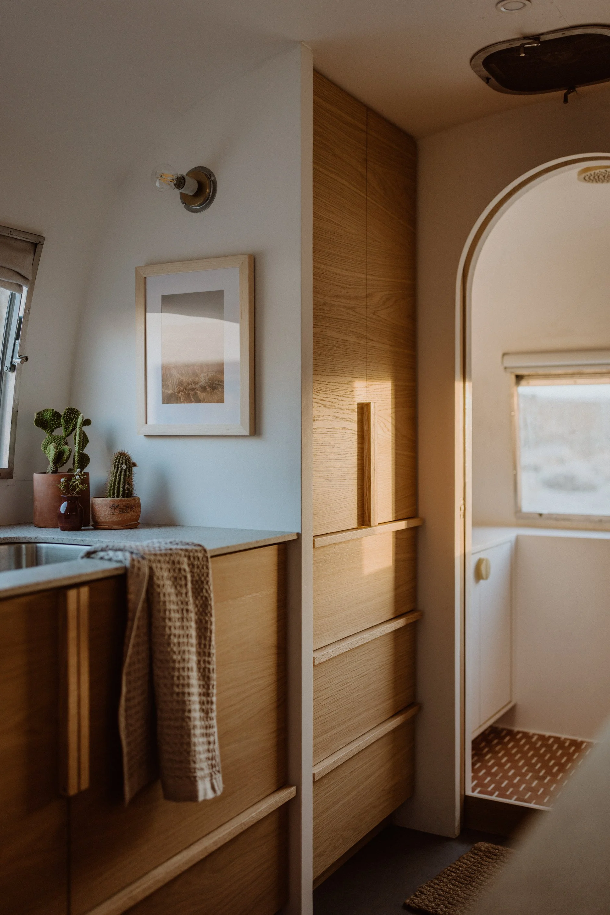 A design inspired by the open deserts of Southern California. Exquisite and subtle, every detail was chosen to reflect quality, craftsmanship, and renewal. The end result is a space that feels less like a travel trailer and more like a luxury home on the road. Airstream already being a top-of-the-line brand, we took it to the next level with custom solid surface countertops that waterfall perfectly into the dinette maintaining a flow throughout the whole space. White oak and unlacquered brass are featured throughout, and the bathroom maintains elegance with a solid hardwood pocket door and locally sourced terracotta tile.
