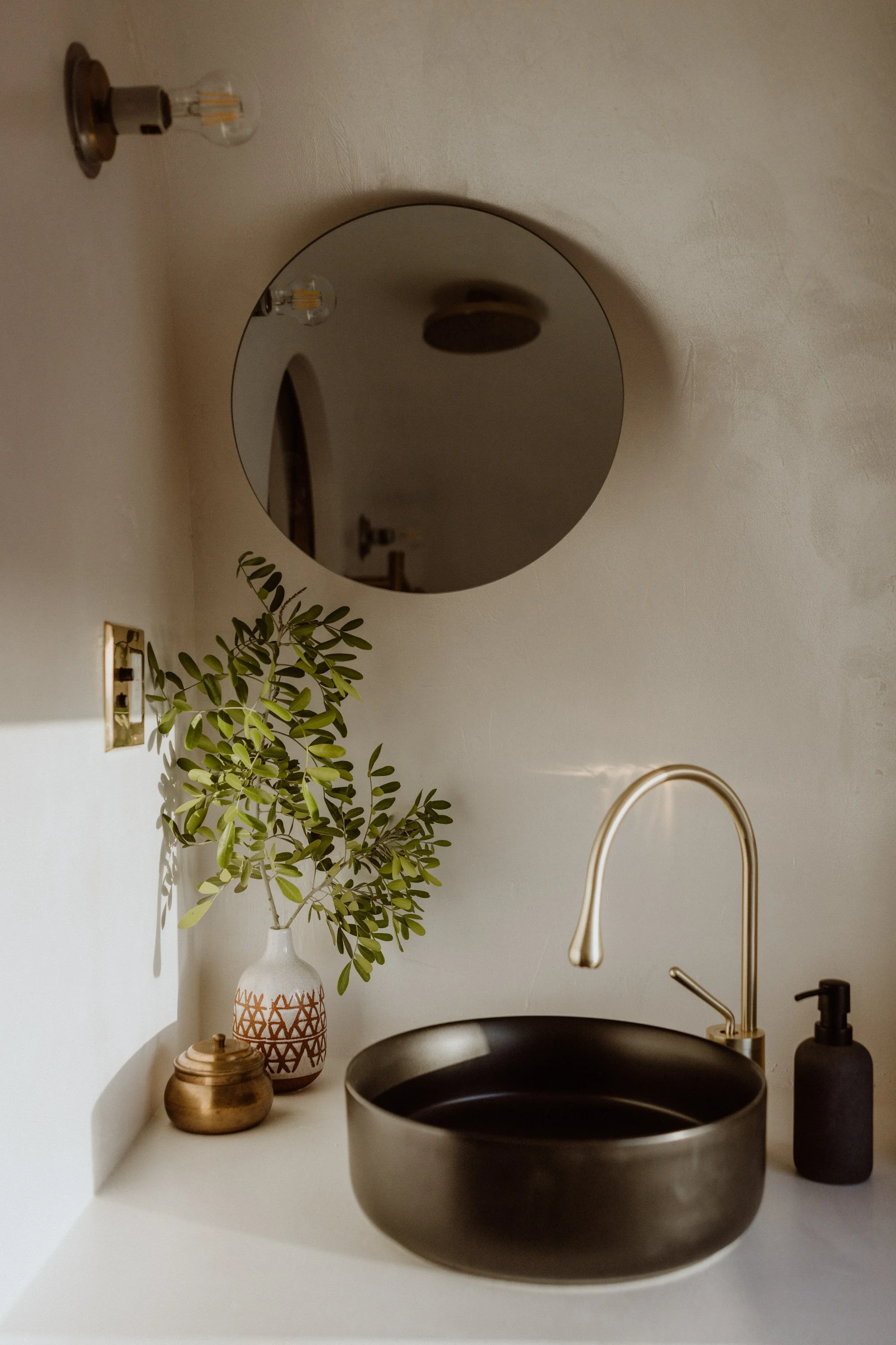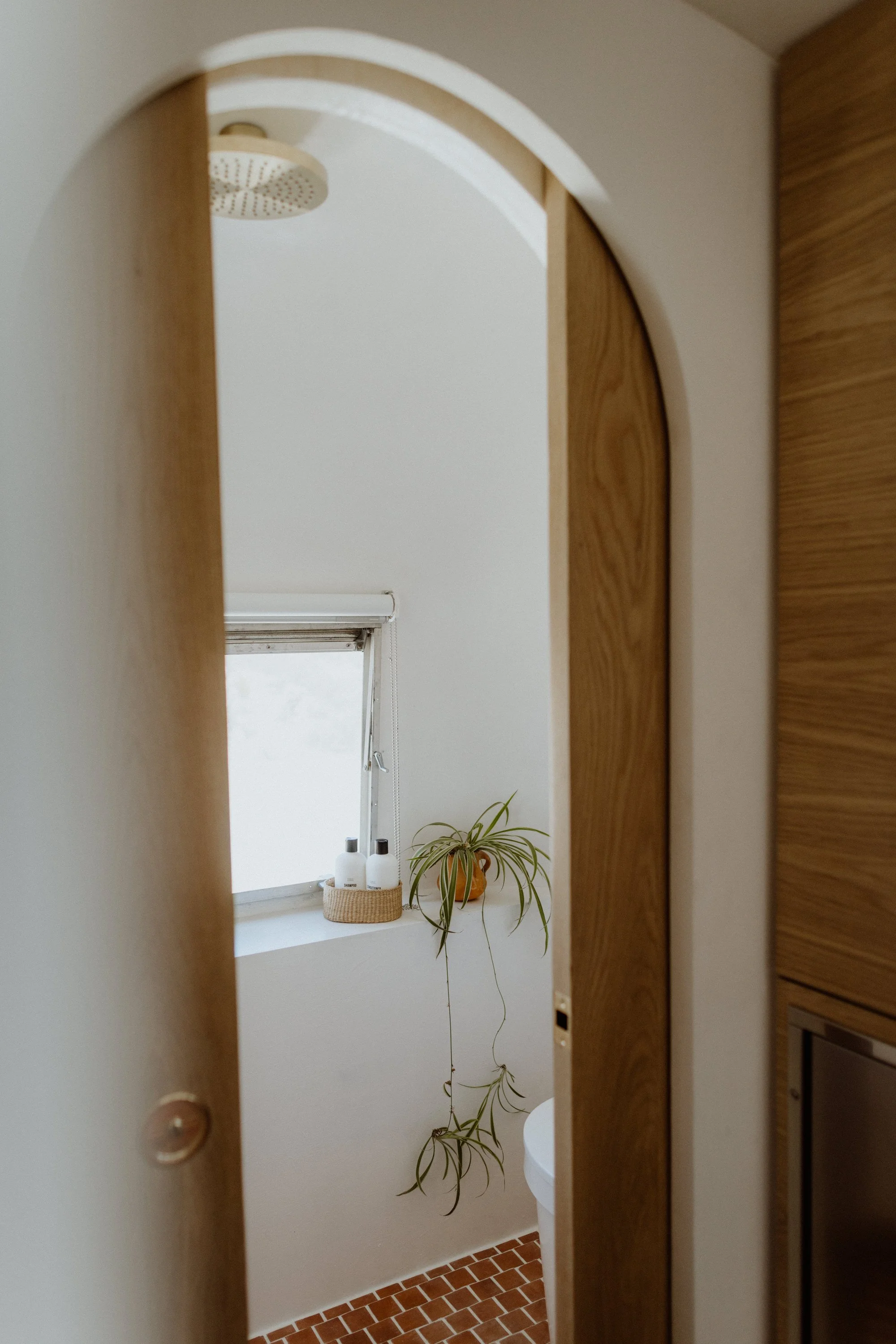 In the rear of the airstream behind a solid white oak pocket door is a spacious bathroom that maintains the elegance of the rest of the living space. This space is a luxurious take on a RV wetbath with locally sourced terracotta tile and an integrated vanity. The shower was designed to be comfortable for tall individuals and features a brass rainfall head embedded into the curved ceiling. The Separett toilet is a top of the line waterless model made in Sweden and is widely regarded as the best for ease of use and eco consciousness. The bathroom features a heated towel warming rack to keep it cozy on cold days.