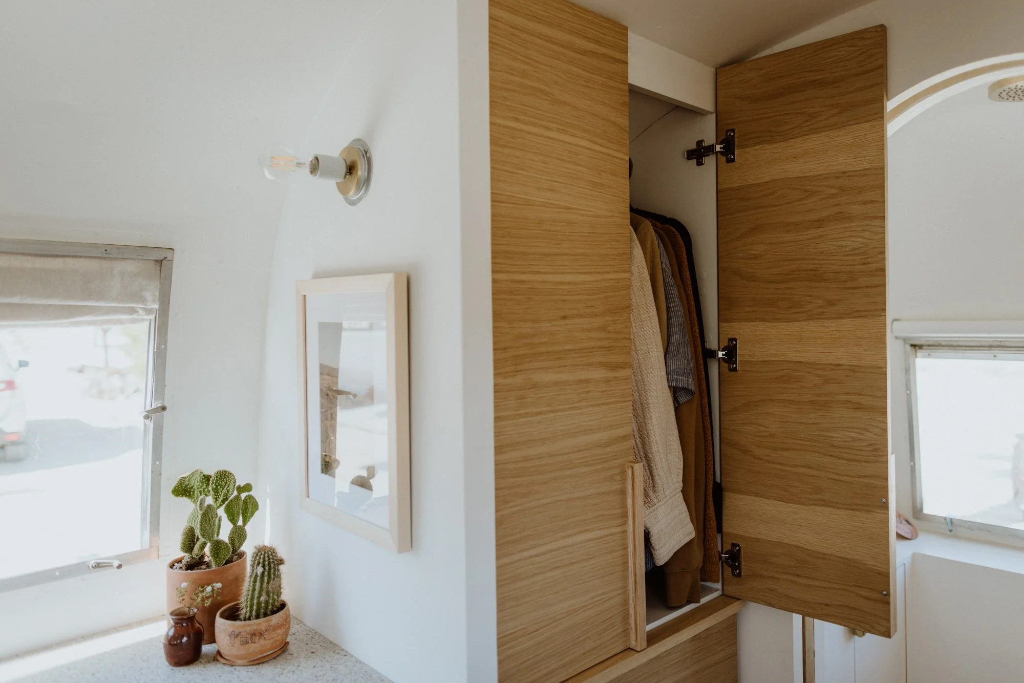 The sleeping area is thoughtfully integrated with the rest of the open space and features a premium RV queen mattress atop a white oak bed structure with ample built-in storage space. Surrounded by windows, the bed area is the best space in the Airstream to watch sunrise from, and the rare panoramic vista view windows along the curve of the ceiling make it possible to stargaze without leaving the bed. Along with two drawers under the bed, the back of the airstream includes three more large drawers and a closet to hang clothes and store all of your personal items.