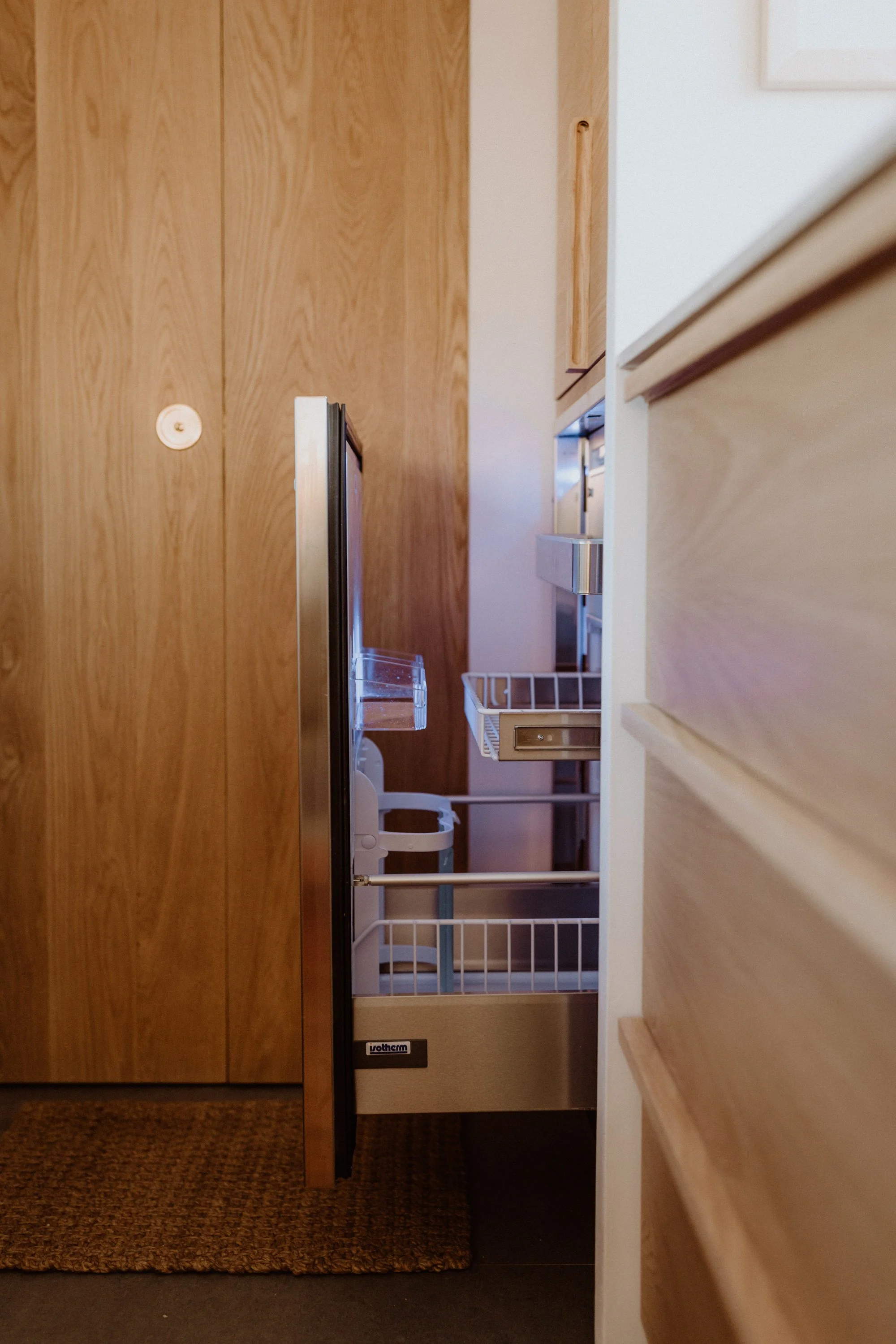 Anza features a kitchen any chef would love. The white oak cabinetry offers plenty of usable storage space and features luxury upgrades such as concealed soft close hard slides and a custom nesting drawer for smaller items and utensils. The gas oven/range combo runs on propane for ease of use on the road, and the large residential-style deep sink makes cleanup a non-issue. We also chose a premium delta faucet for its touch-on function which is crucial for saving water while staying off-grid. Perishables are kept fresh in the drawer-style refrigerator and the pantry above features slide-out shelves for easy organization. Elegant flow is maintained throughout the kitchen space with the terrazzo counters waterfalling seamlessly into a linen-cushioned bench seat. The dining table was custom built using the same white oak as the cabinetry throughout.